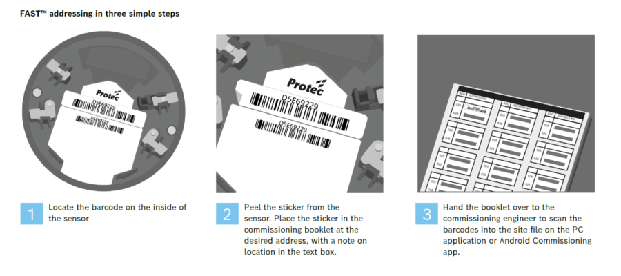 Hard addressing isn’t the case with the Protec 6000PLUS devices. We use our FAST™ method, a software-based commissioning method whereby we allocate a unique address at the manufacturing stage. The address comes in the form of two identical barcodes on the bottom of each device.