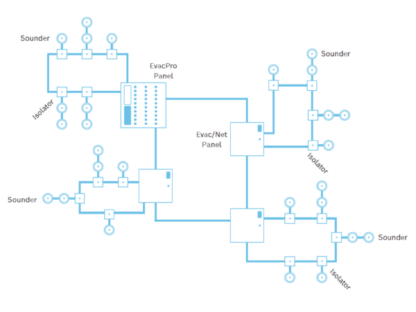 When greater scalability is needed, the EvacPro can be connected to an EvacPro/NET network unit which expands system capabilities by adding four-loop extensions per unit. With the latest regulatory update (BS 8629:2019+A1:2023), EvacPro now supports system networking, making it possible to create large-scale, complex evacuation systems for taller and more densely populated buildings without limitations.